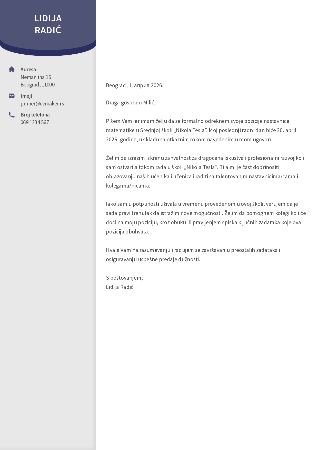 Želim da izrazim svoju zahvalnost za iskustva i rast koje sam stekla tokom svog boravka u školi. Bilo je zadovoljstvo raditi sa Vama i kolektivom. Međutim, verujem da je pravi trenutak da potražim nove izazove koji se poklapaju sa mojim karijernim aspiracijama.